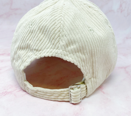 Adorable corduroy WIFEY ball cap with gold glittering fuzzy patch lettering! Has great fit with perfect curved brim. Clip closure on the back to adjust size and hidden pocket for seamless look. Great details all around.